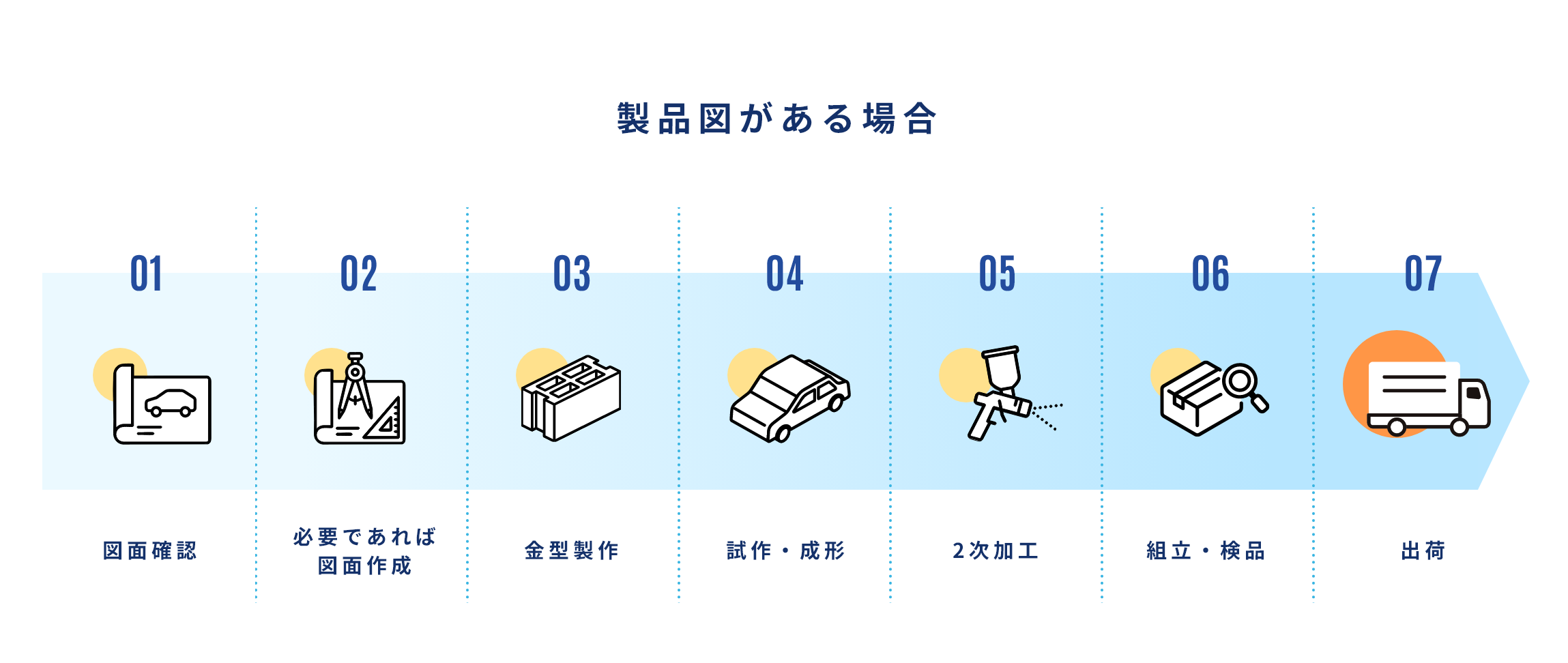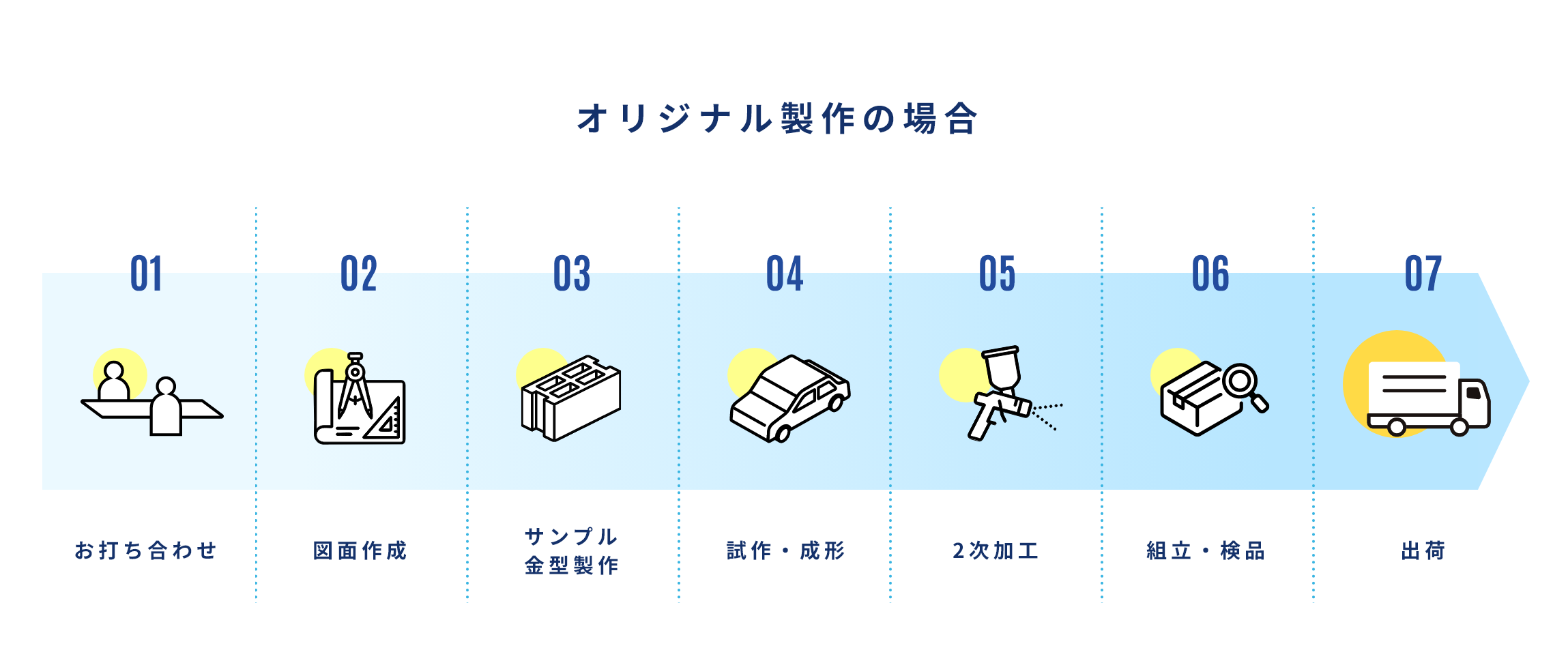 製品の仕様や数量、生産場所により異なりますが、試作であれば数週間程度、設計・金型・量産で3 ヶ月~4 ヶ月程度が目安です。お急ぎの場合もぜひご相談ください。